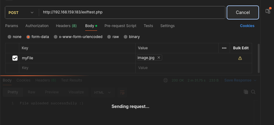 • Upload this image using postman (key:myFile is discovered from Wireshark packet)